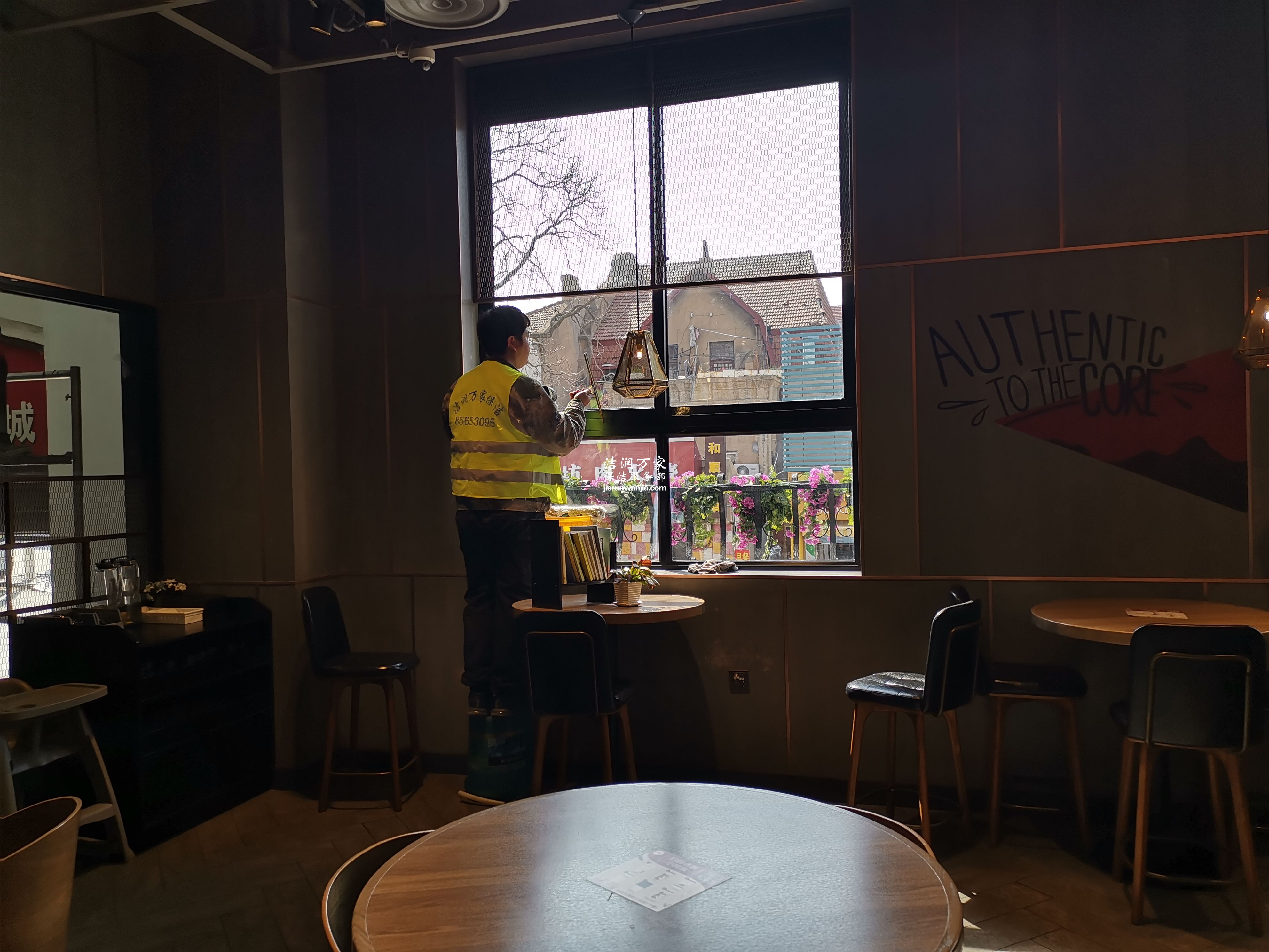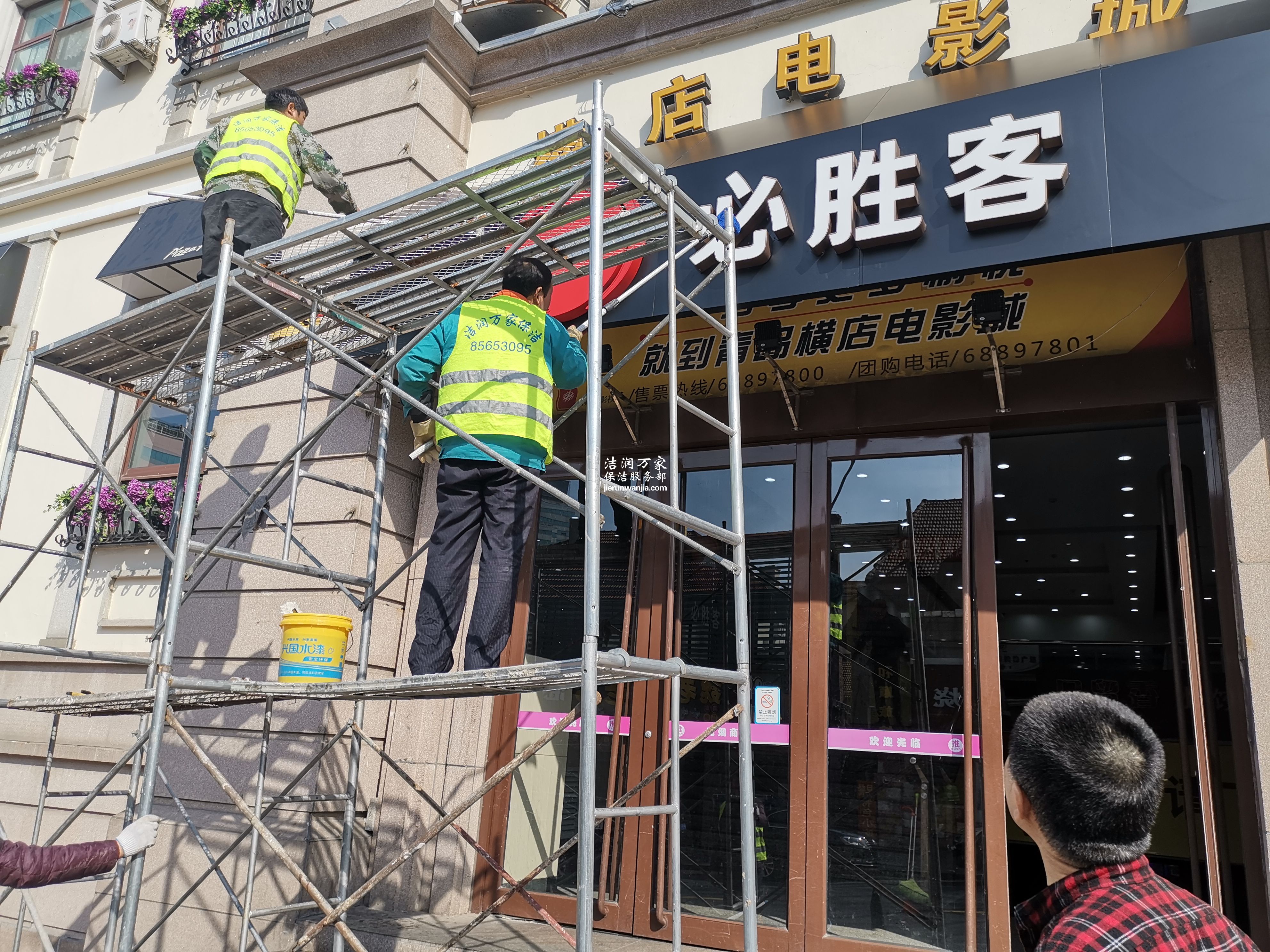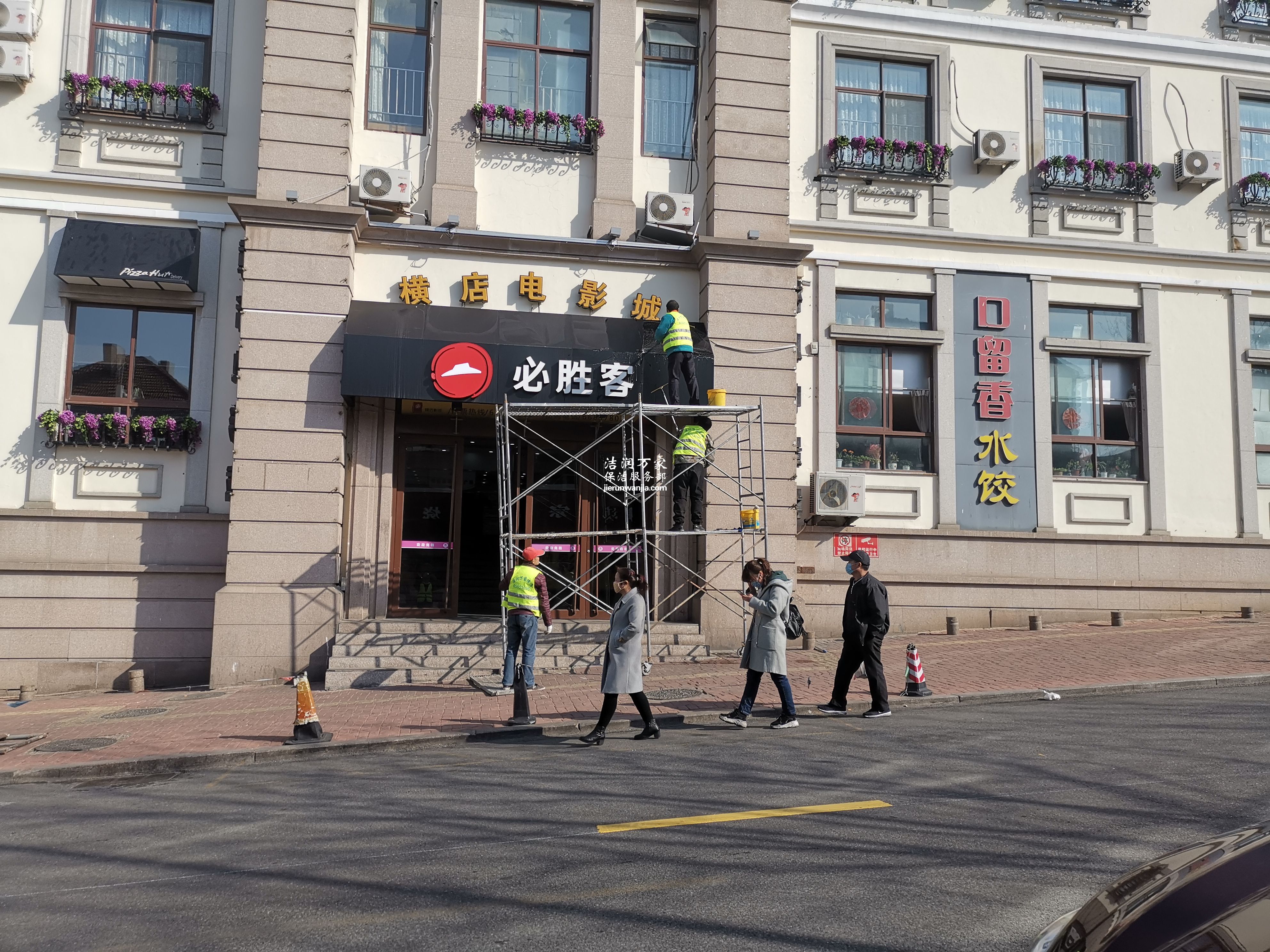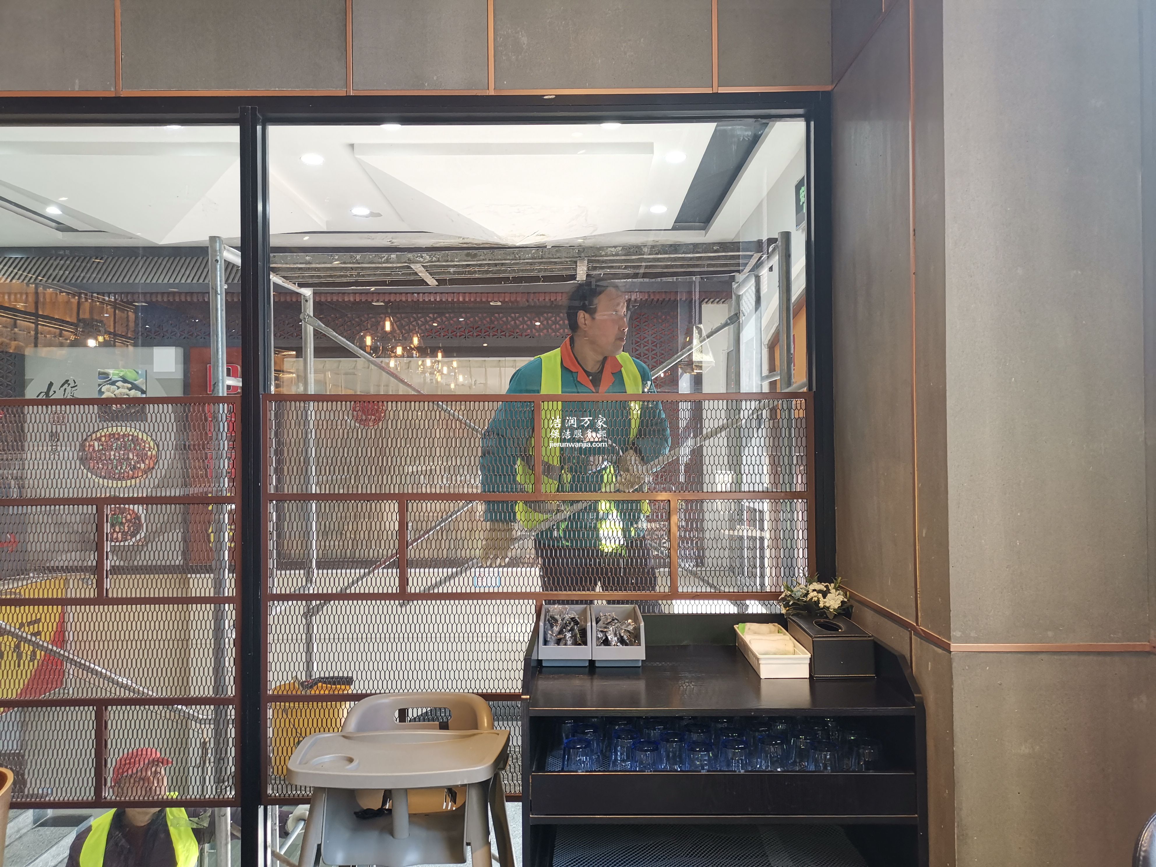 青岛保洁,青岛保洁公司洁润万家保洁,对青岛中山路必胜客店的门头及室内外玻璃进行了***的清洁